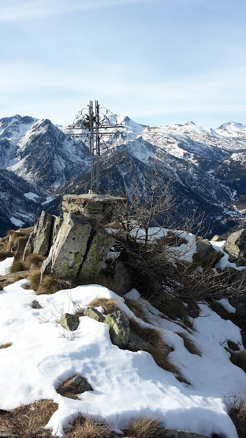 Al colle c'è neve ma non si sprofonda più di tanto e, tenendo la cresta, raggiungiamo la cima. Non c'è un alito di vento e la vista è, come sempre, spettacolare.