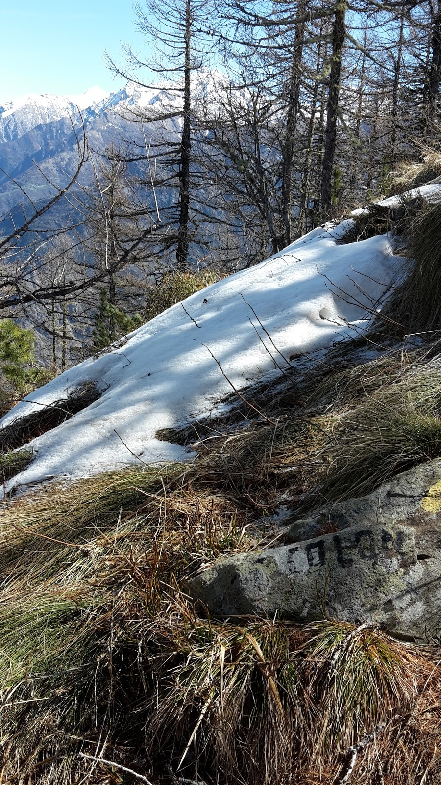 Arrivati al colle, svoltiamo a destra (su un pietrone c'è la scritta COLON). Da qui il sentiero non è sempre evidente. C'è ancora un po' di neve e occorre fare attenzione a non scivolare.